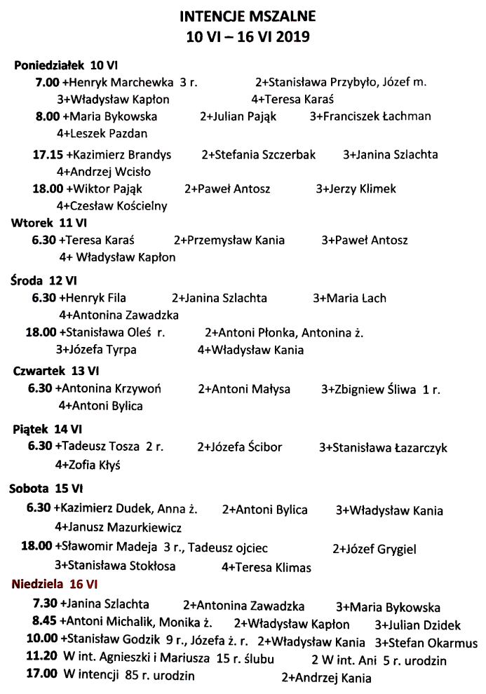 Intencje mszalne 10 – 16 czerwca 2019 r.