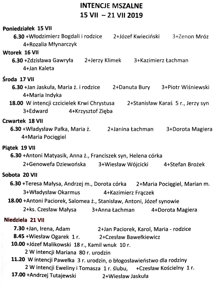 Intencje mszalne 15 – 21 lipca 2019 r.