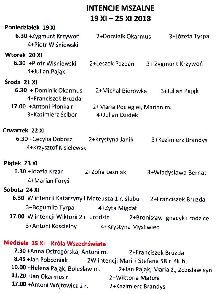 Intencje mszalne 17 – 23 listopada 2025 r.