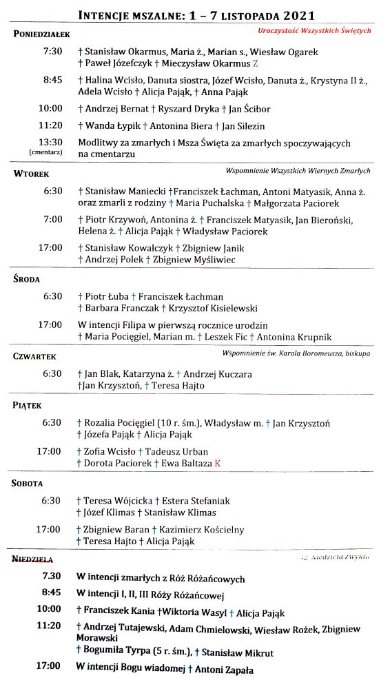 Intencje mszalne 1 – 7 listopada 2021 r.