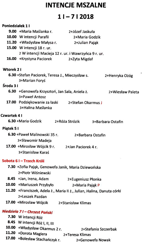 Intencje mszalne 1 – 7 stycznia 2018 r.