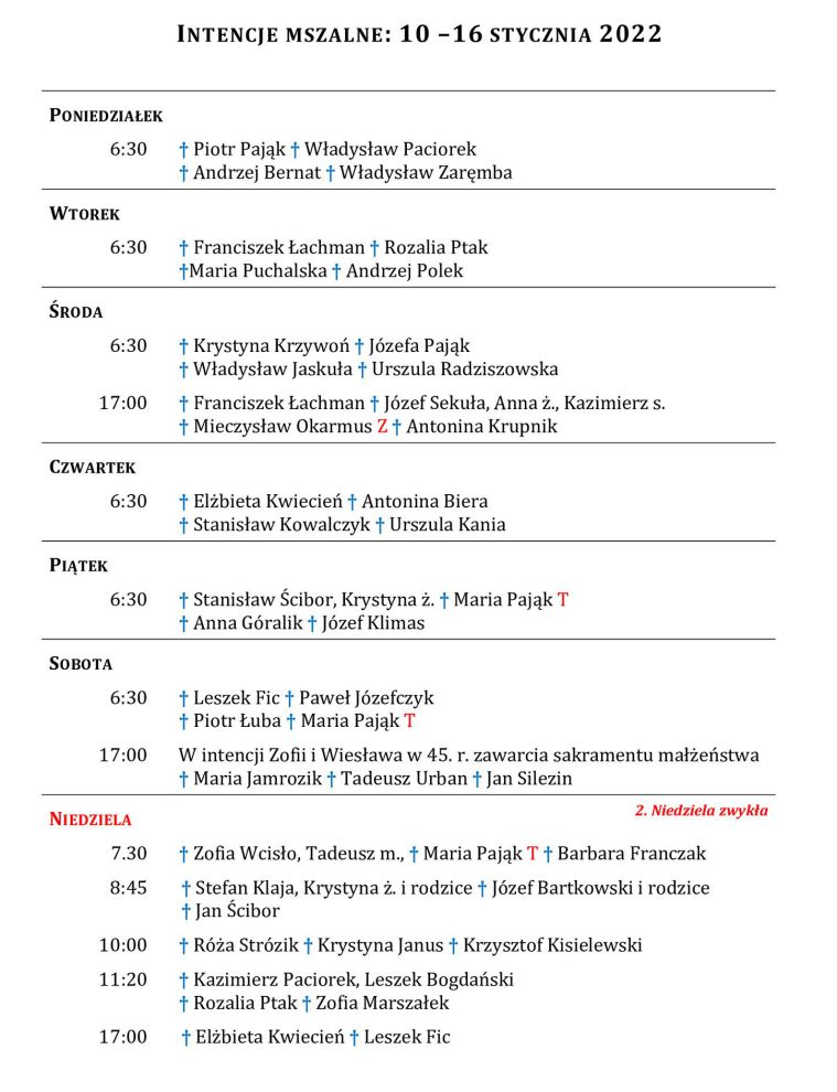 Intencje mszalne 10 – 16 stycznia 2022 r.