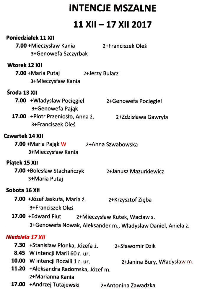 Intencje mszalne 11 – 17 grudnia 2017 r.