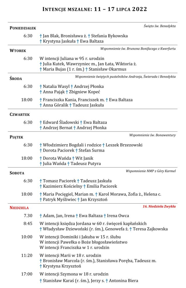 Intencje mszalne 11 – 17 lipca 2022 r.
