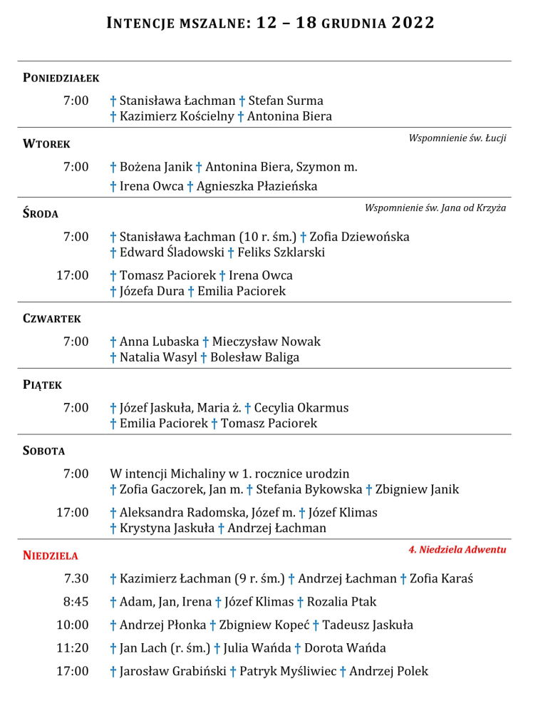 Intencje mszalne 12 – 18 grudnia 2022 r.