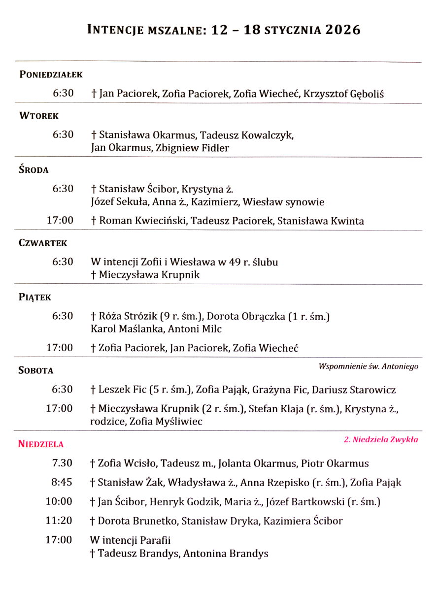 Intencje mszalne 12 -18 stycznia 2026 r.