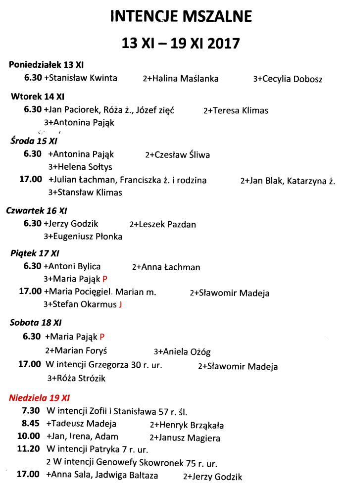 Intencje mszalne 13 – 19 listopada 2017 r.
