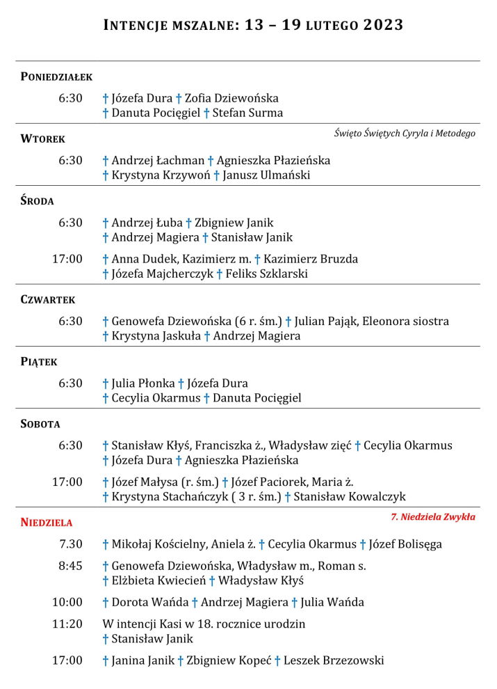 Intencje mszalne 13 – 19 lutego 2023 r.