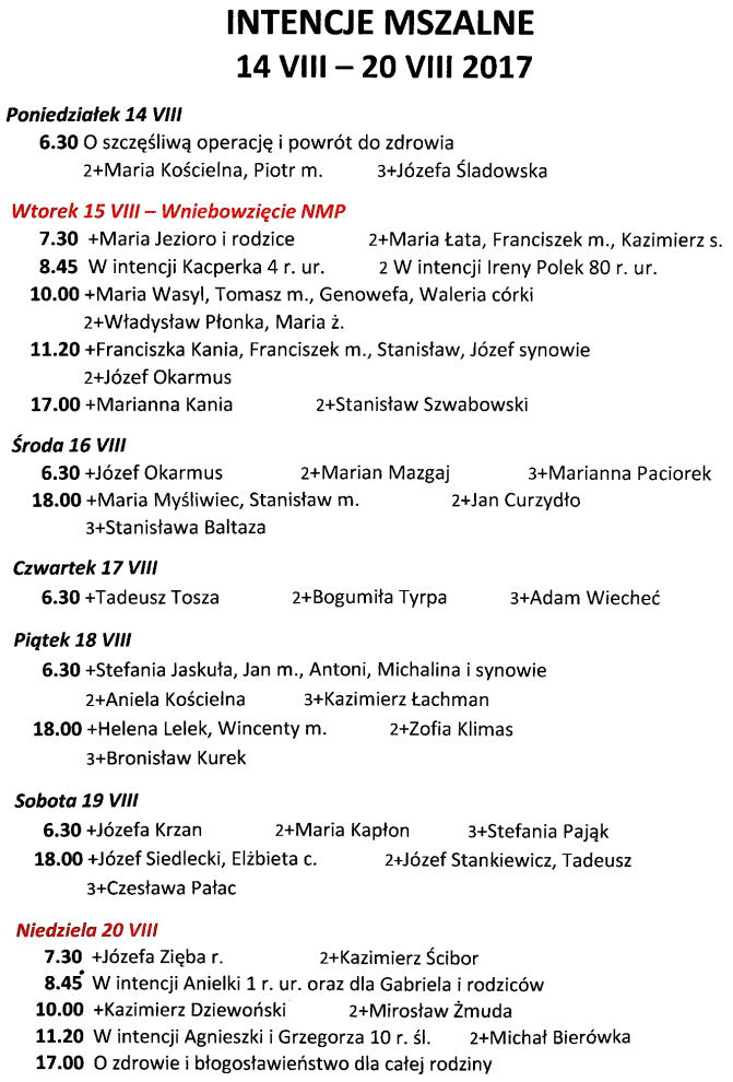 Intencje mszalne 14 – 20 sierpnia 2017 r.