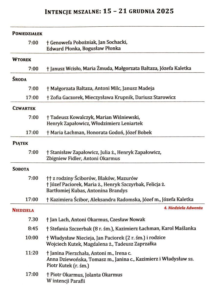 Intencje mszalne 15 – 21 grudnia 2025 r.