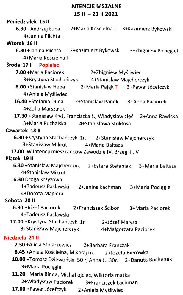 Intencje mszalne 15 – 21 lutego 2021 r.