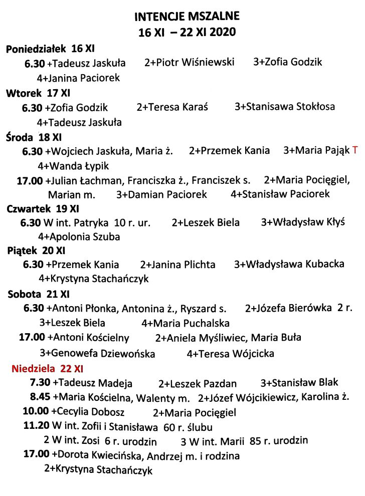 Intencje mszalne 17 – 23 listopada 2025 r.