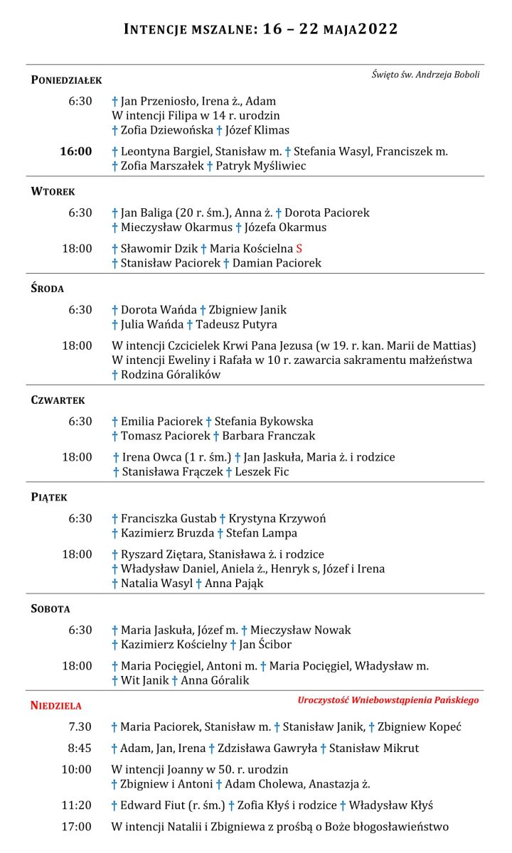 Intencje mszalne 16 – 22 maja 2022 r.