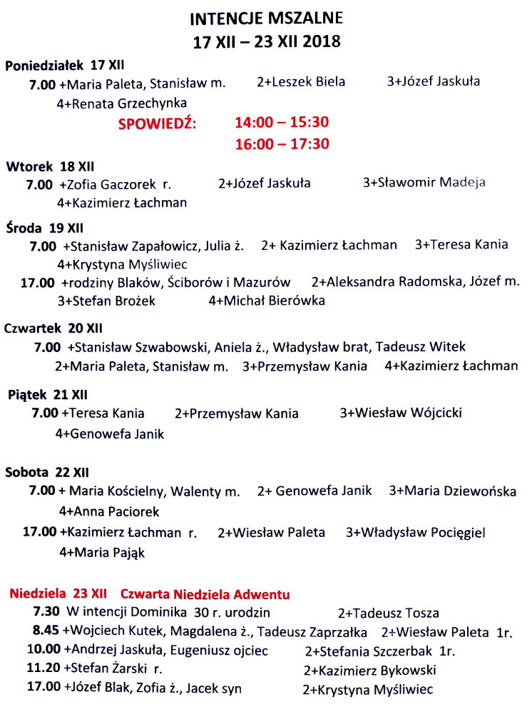 Intencje mszalne 17 – 23 grudnia 2018 r.