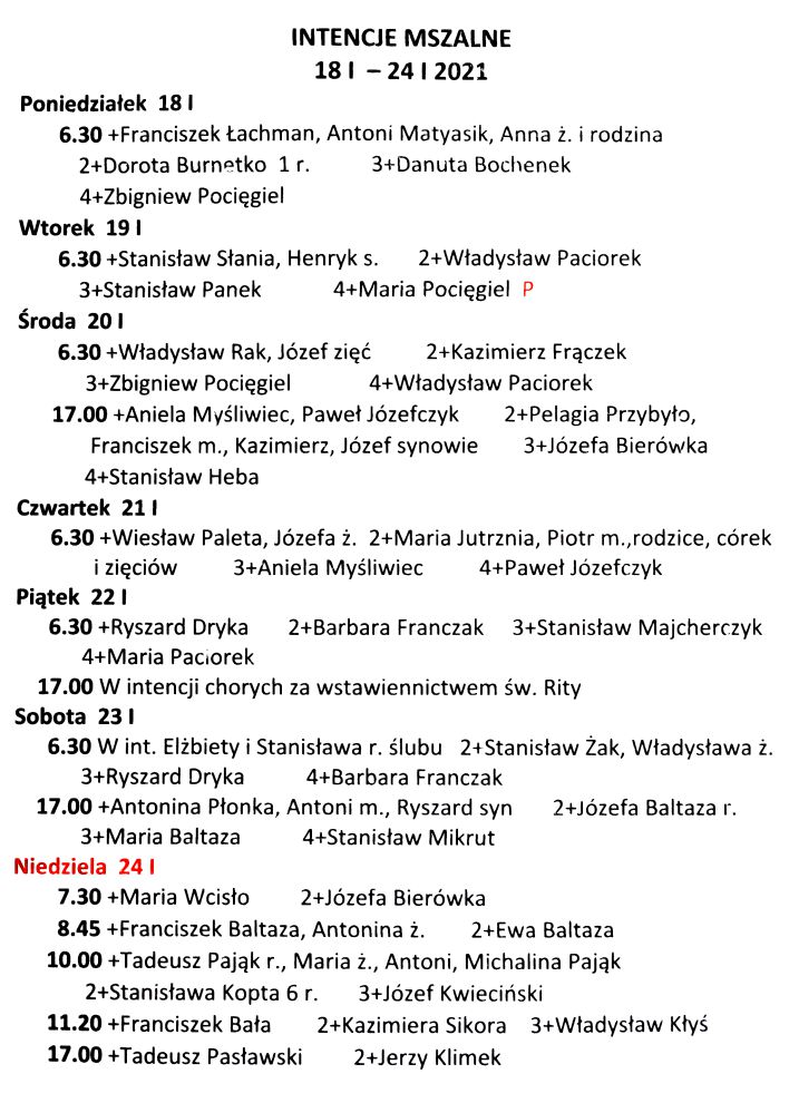 Intencje mszalne 18 – 24 stycznia 2021 r.