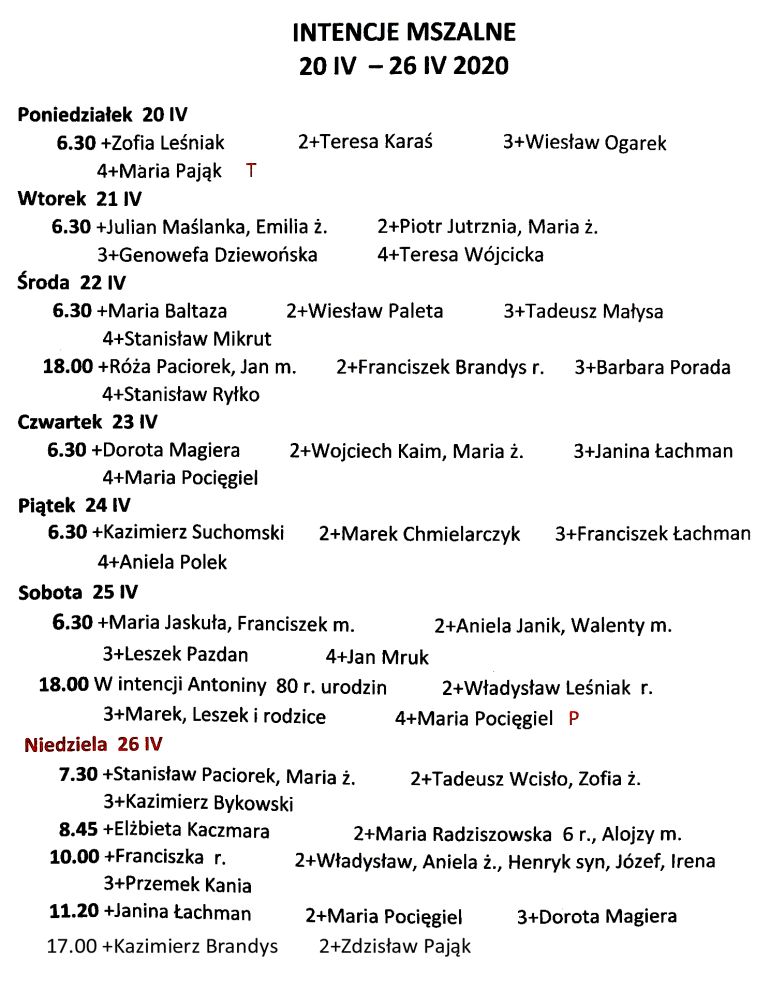 Intencje mszalne 20 – 26 kwietnia 2020 r.