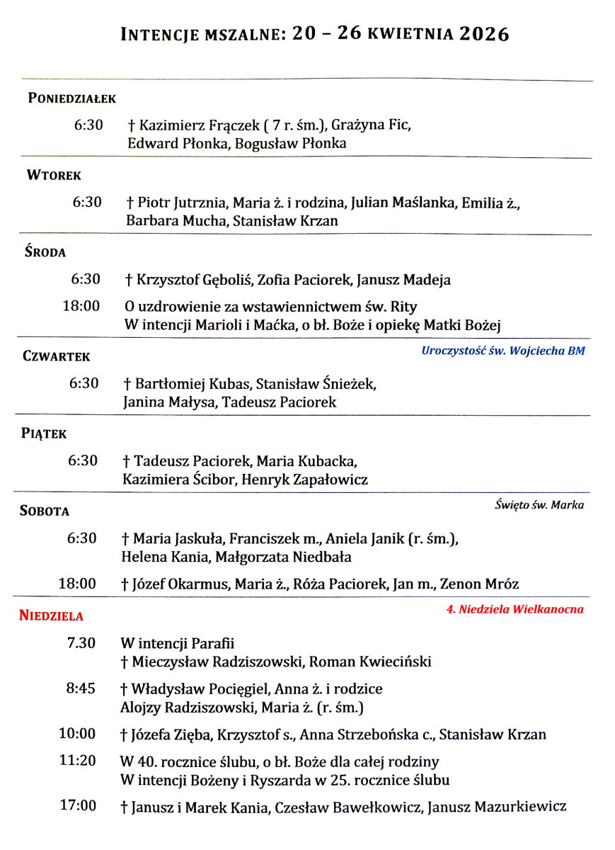 Intencje mszalne 20 – 26 kwietnia 2026 r.