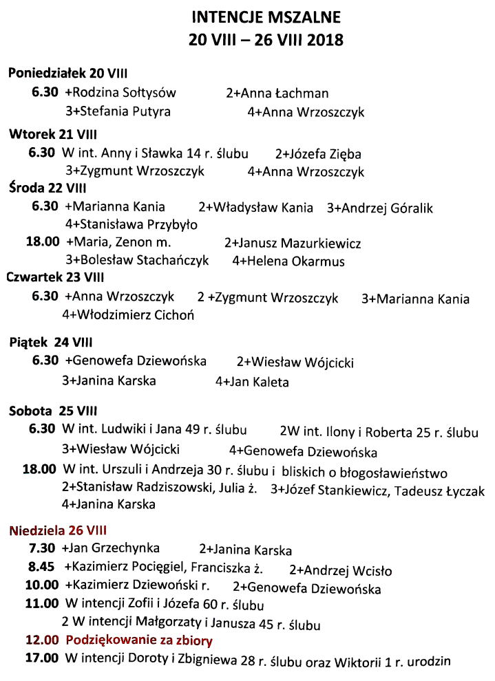 Intencje mszalne 20 – 26 sierpnia 2018 r.