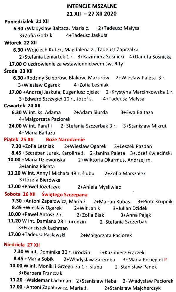 Intencje mszalne 21 – 27 grudnia 2020 r.