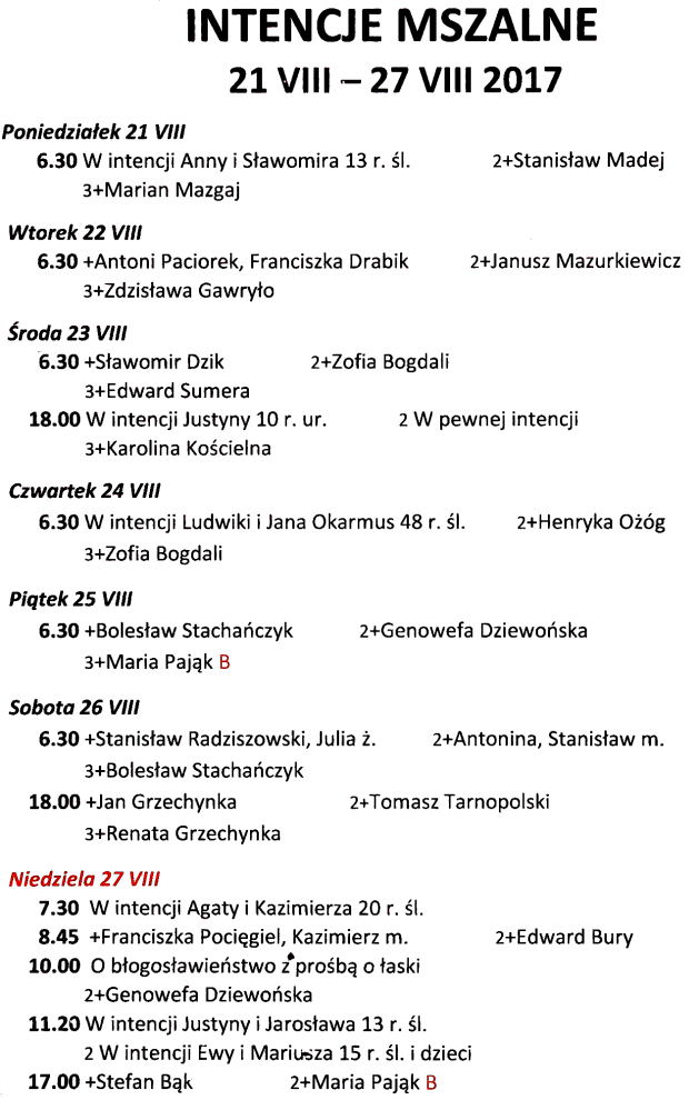 Intencje mszalne 17 – 23 listopada 2025 r.