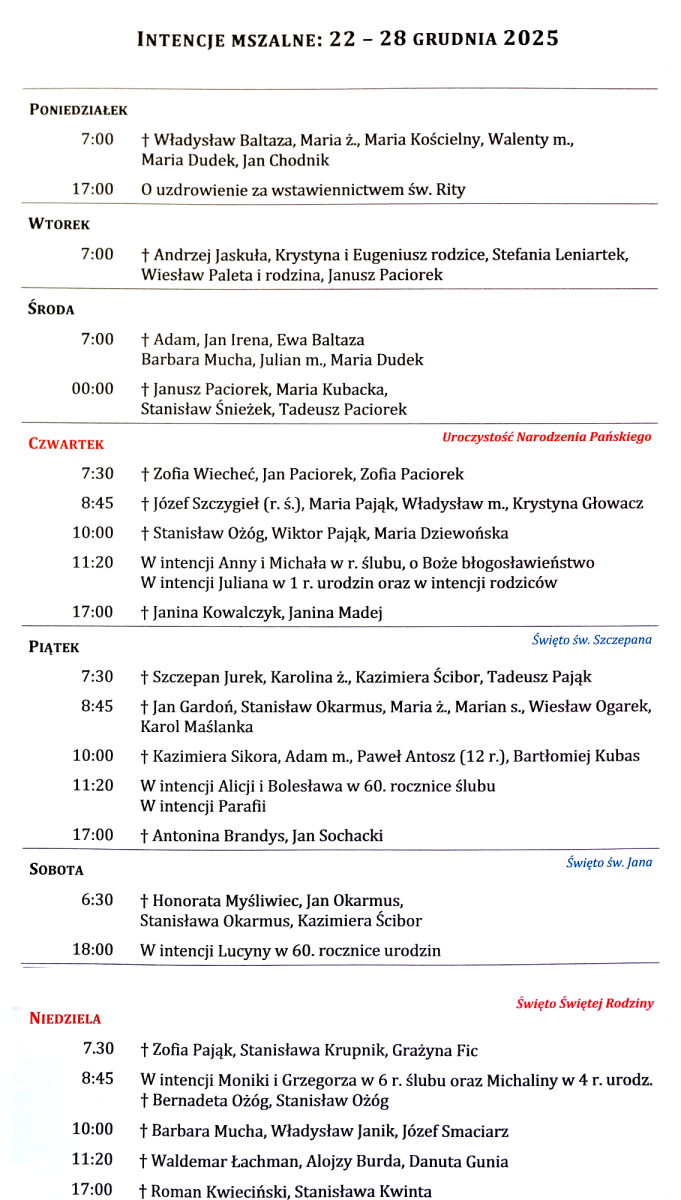 Intencje mszalne 22 – 28 grudnia 2025 r.