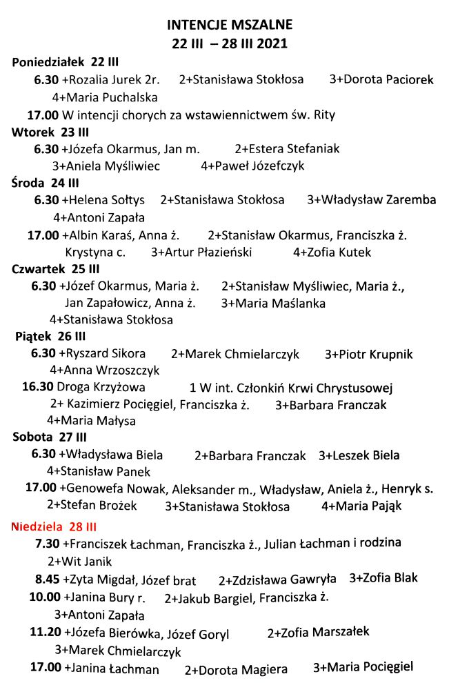 Intencje mszalne 22 – 28 marca 2021 r.