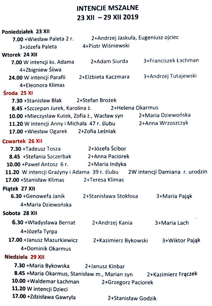 Intencje mszalne 23 – 29 grudnia 2019 r.
