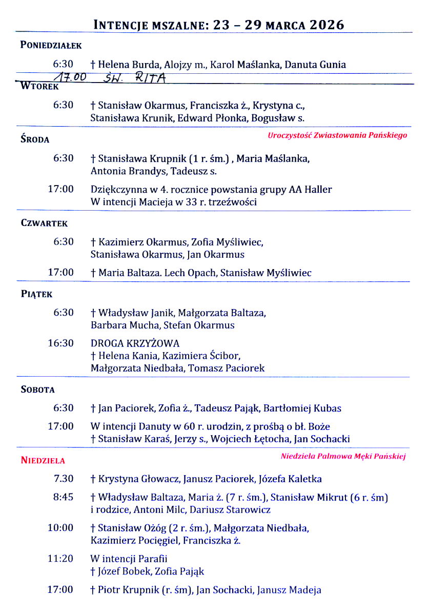 Intencje mszalne 23 – 29 marca 2026 r.