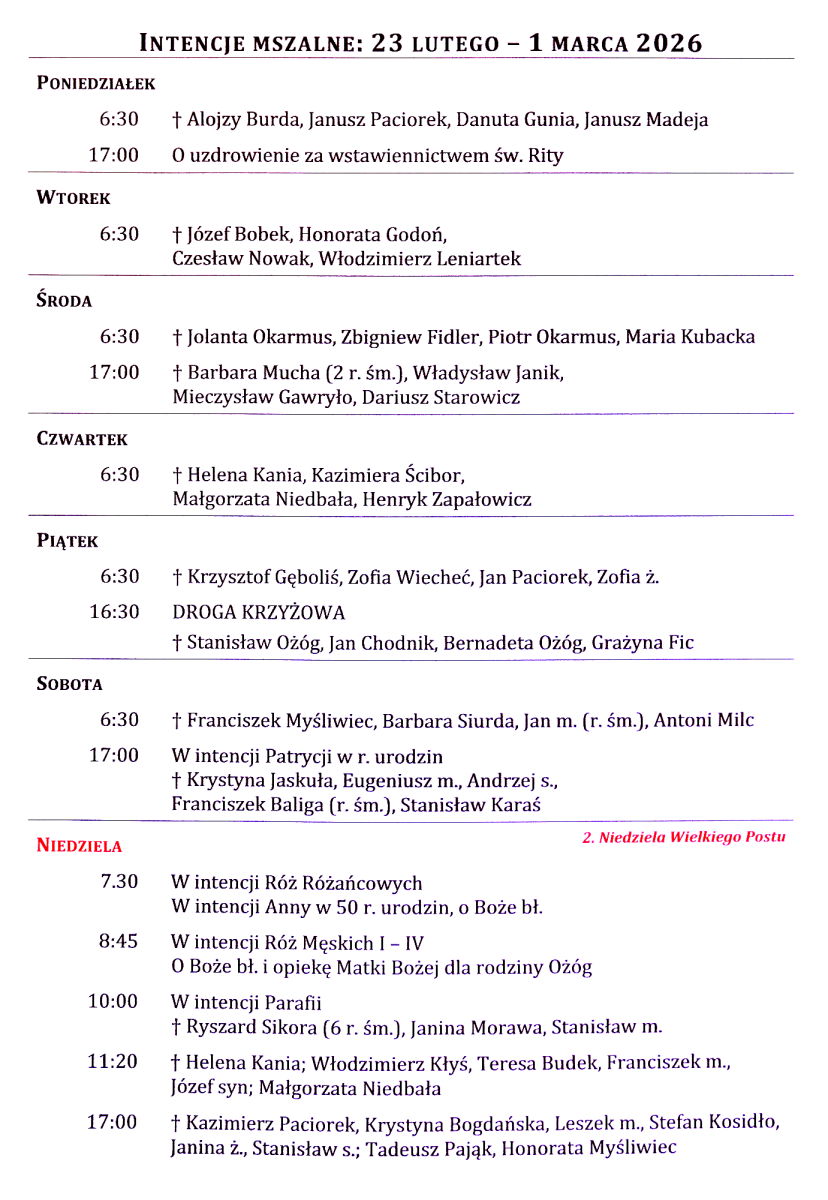 Intencje mszalne 16 – 22 lutego 2026 r.