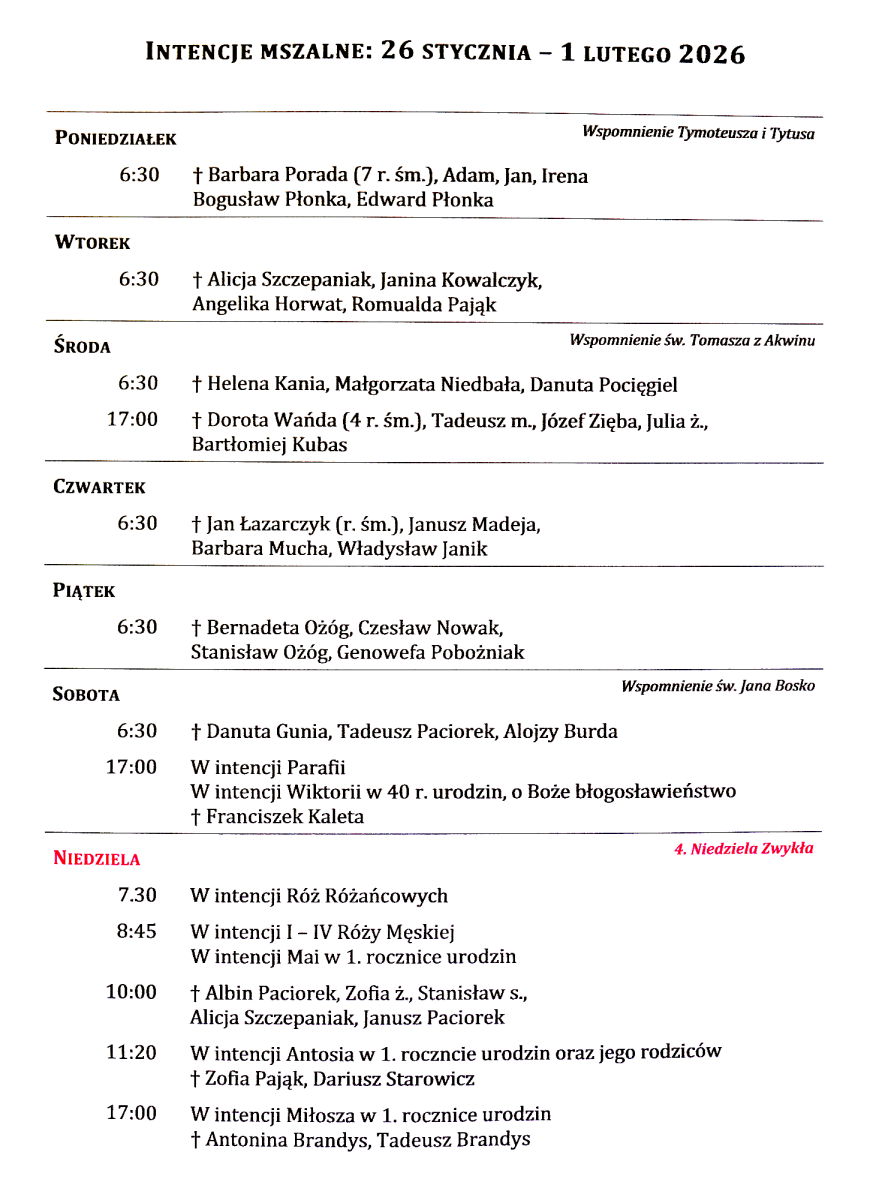 Intencje mszalne 26 stycznia – 1 lutego 2026 r.