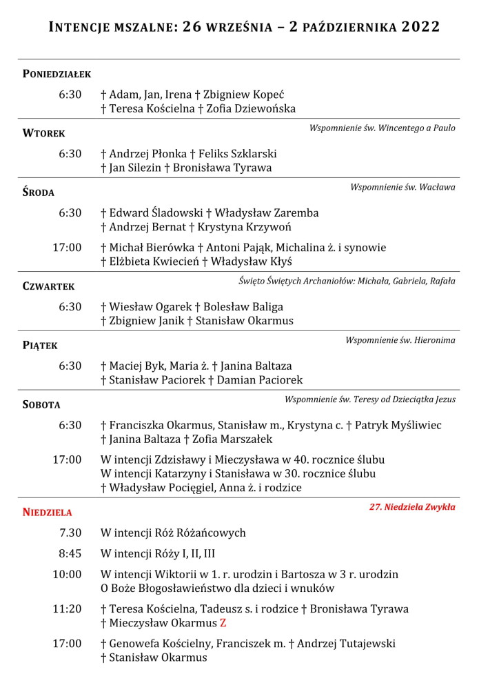 Intencje mszalne 26 września – 2 października 2022 r.