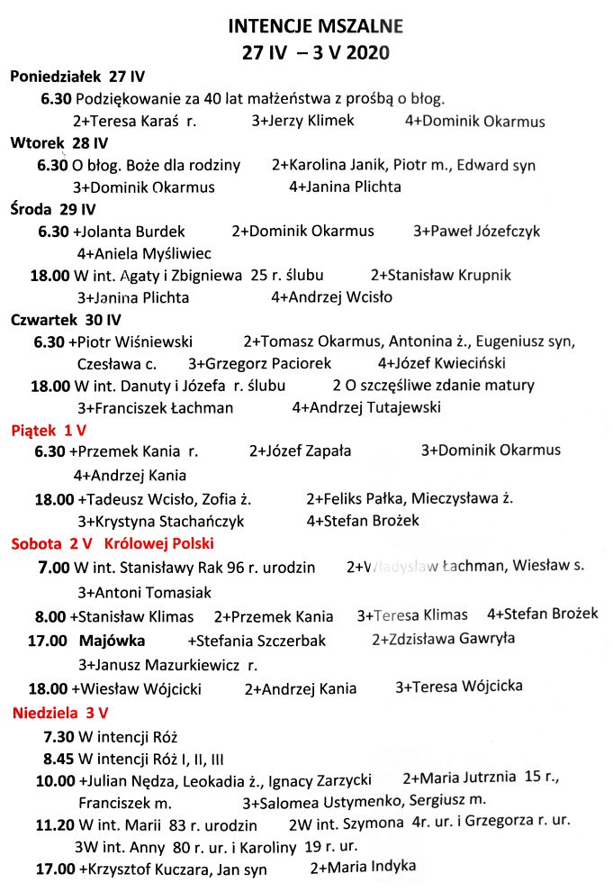 Intencje mszalne 27 kwietnia – 3 maja 2020 r.
