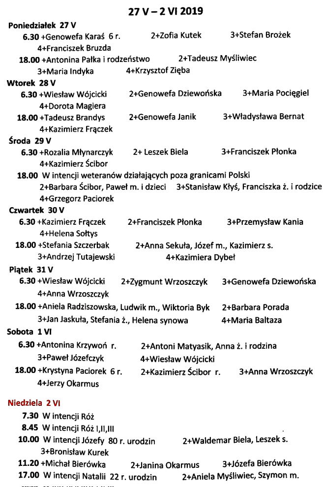 Intencje mszalne 27 maja – 2 czerwca 2019 r.