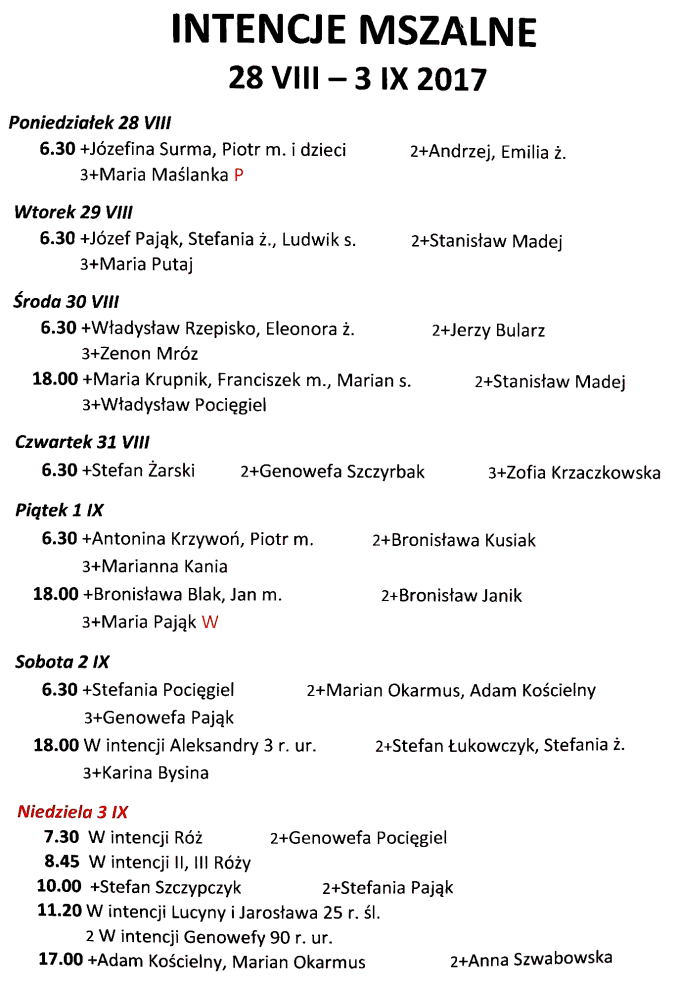 Intencje mszalne 28 sierpnia – 3 września 2017 r.