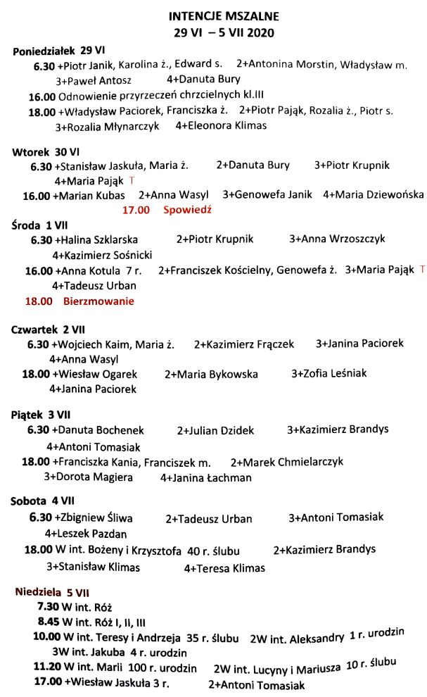Intencje mszalne 29 czerwca – 5 lipca 2020 r.