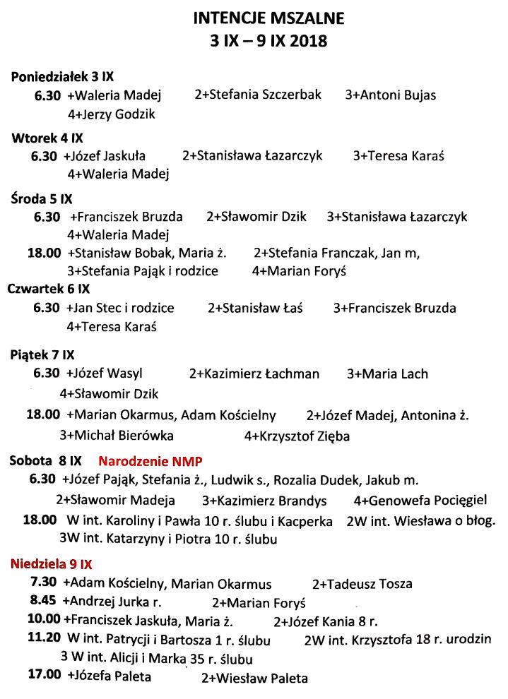 Intencje mszalne 3 – 9 września 2018 r.