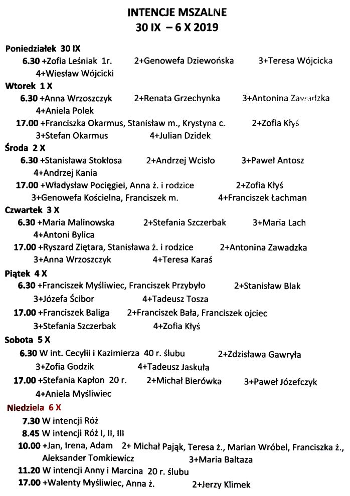 Intencje mszalne 30 września – 6 października 2019 r.
