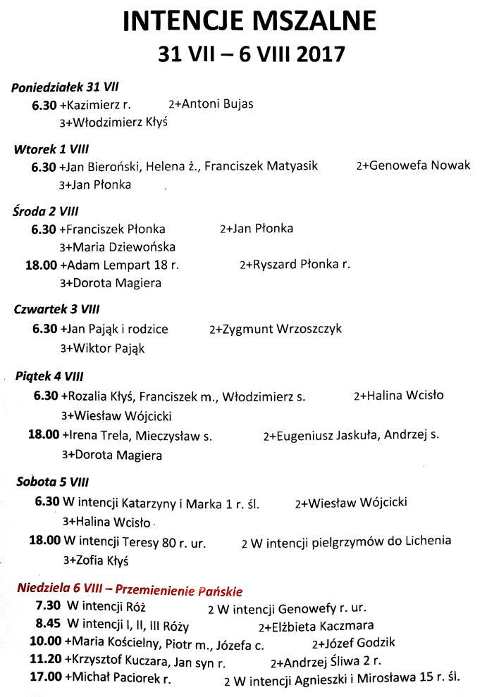 Intencje mszalne 31 lipca – 6 sierpnia 2017 r.