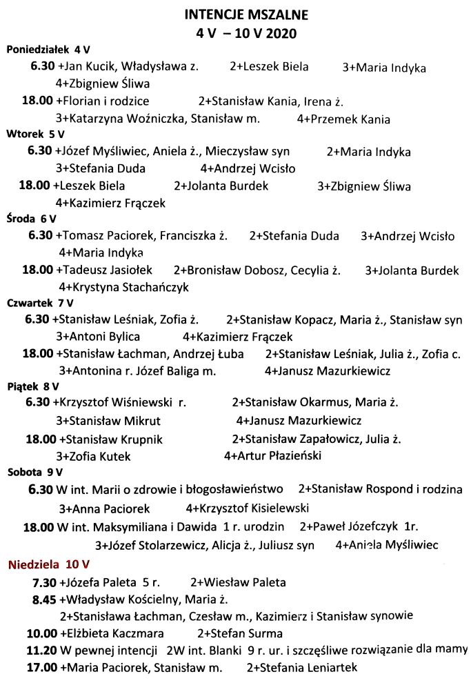 Intencje mszalne 4 – 10 maja 2020 r.