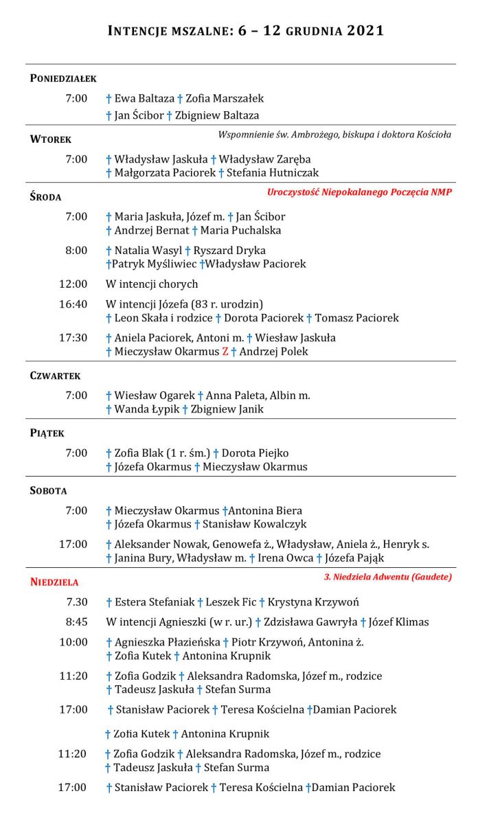 Intencje mszalne 6 – 12 grudnia 2021 r.