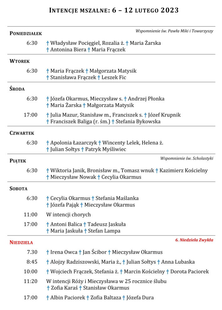 Intencje mszalne 6 – 12 lutego 2023 r.