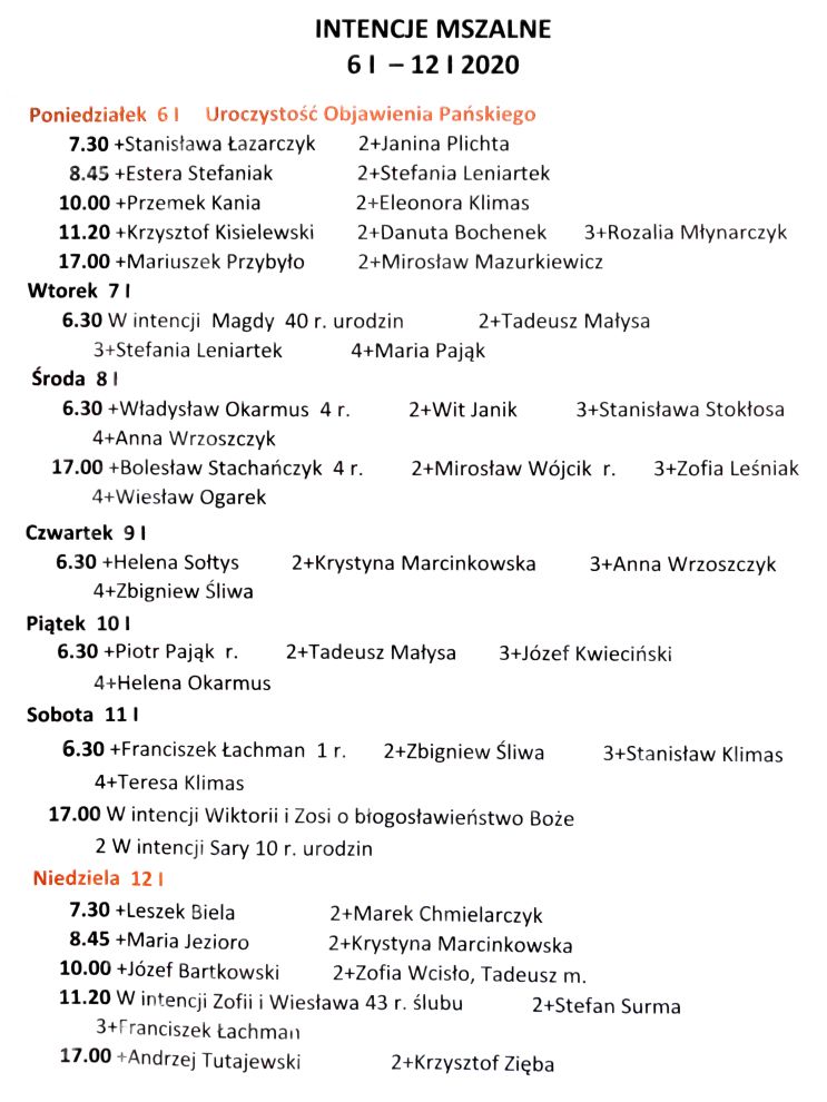 Intencje mszalne 6 – 12 stycznia 2020 r.