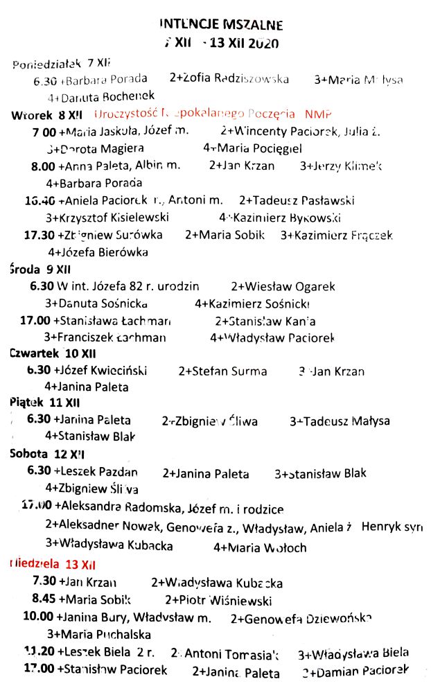 Intencje mszalne 7- 13 grudnia 2020 r.