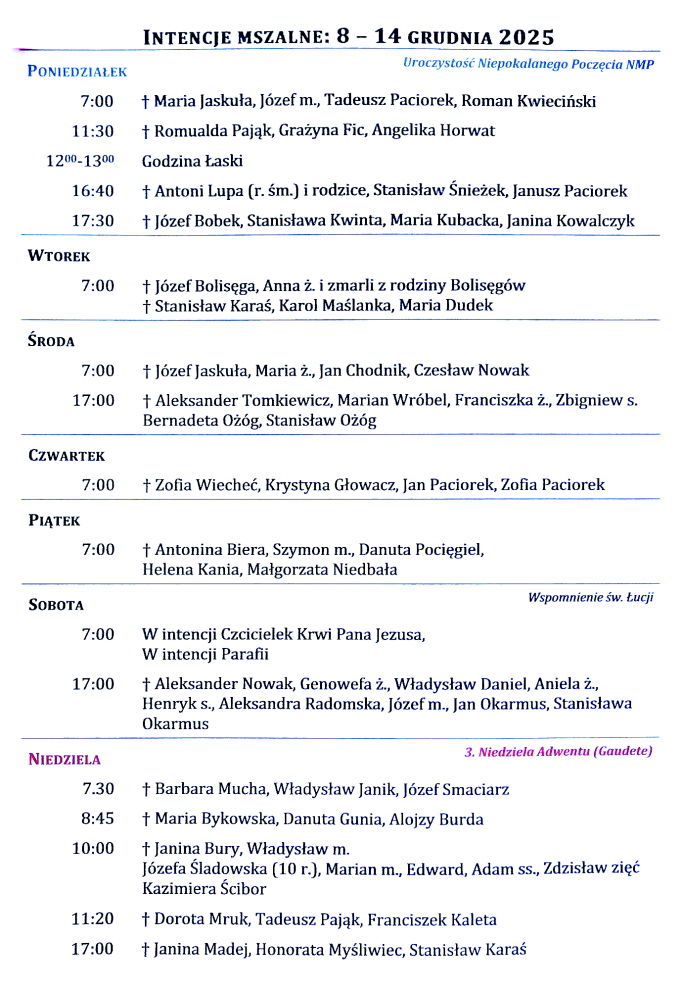 Intencje mszalne 8 – 14 grudnia 2025 r.