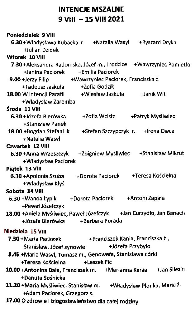 Intencje mszalne 9 – 15 sierpnia 2021 r.