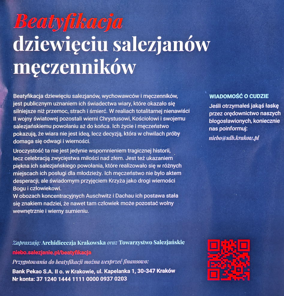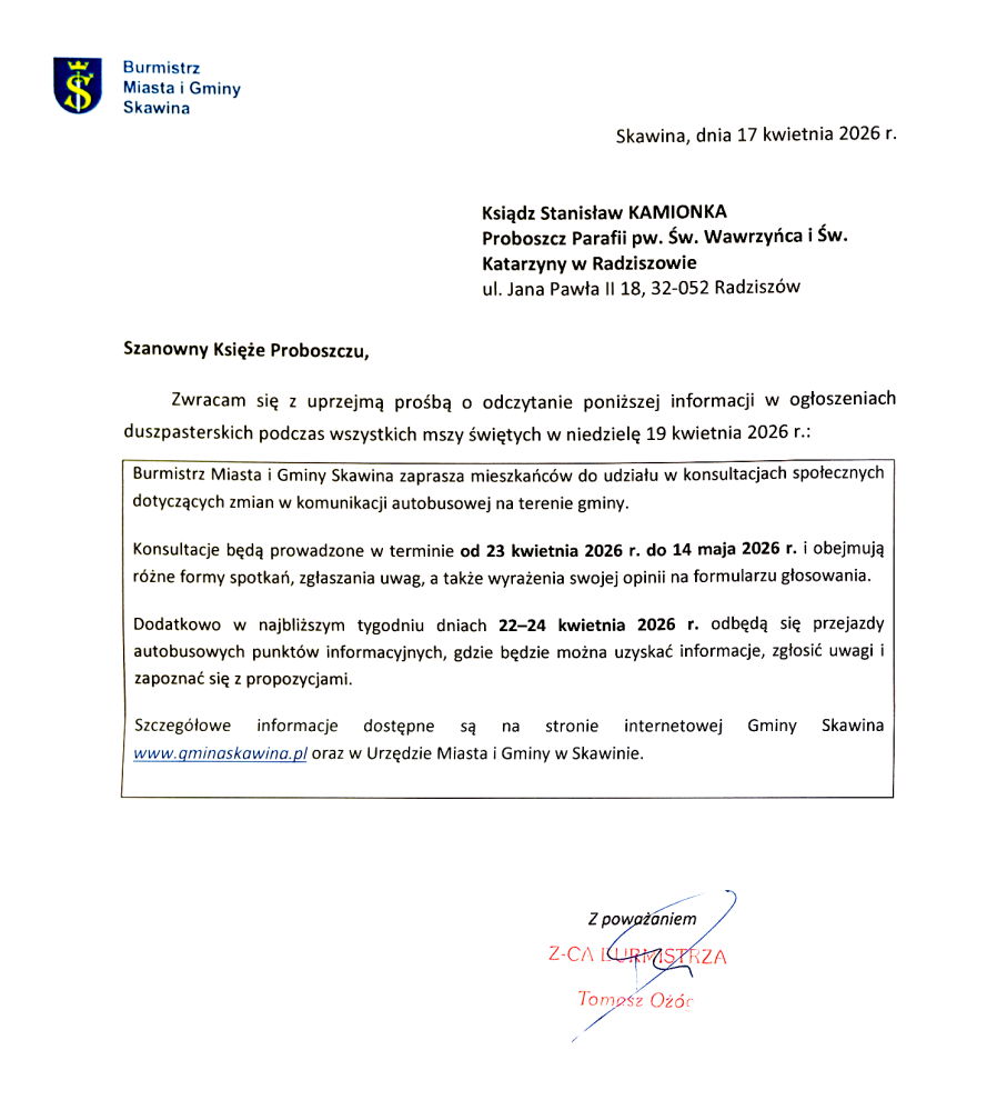 Ksiądz Stanisław Małysa obchodzić będzie w maju tego roku 50-lecie swojego kapłaństwa. Bardzo prosił, aby wydrukować mu obrazki z tej okazji. Potrzebna jest wiedza, ile tych obrazków jest potrzebne. W przyszłym tygodniu Rada Parafialna będzie stać przy kościele. Te osoby, które będą chciały wziąć ten obrazek (to będzie 10 maja 2026 r.), to niech podejdą do Panów z Rady Parafialnej, wezmą małą karteczkę i wrzucą ją do koszyka. Wrzucone karteczki zostaną policzone i będzie wiadomo, ile obrazków będzie potrzeba wydrukować.