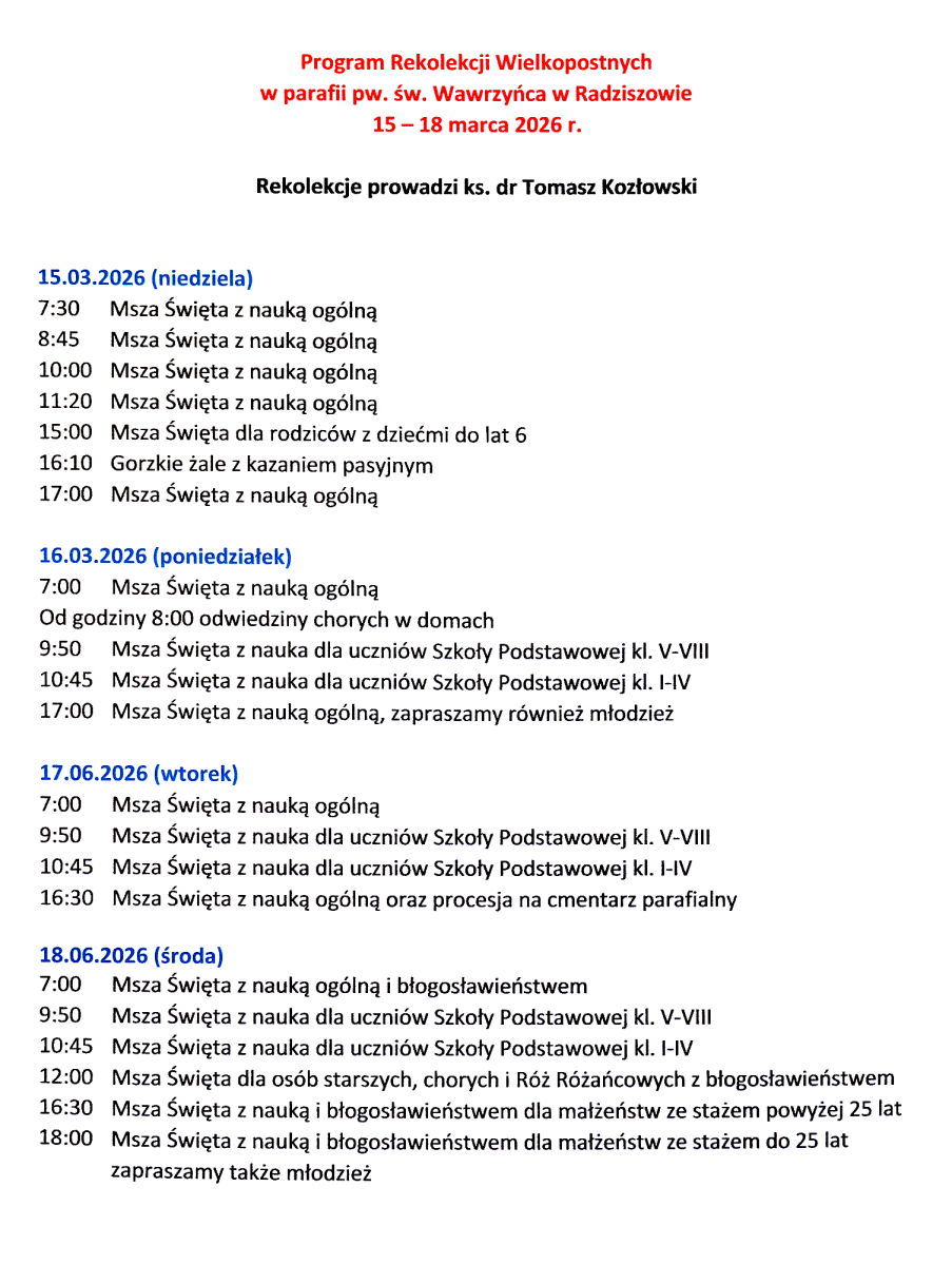 W niedzielę rozpoczniemy rekolekcje wielkopostne. Na zakończenie tradycyjnie w środę podziękujemy ks. Tomaszowi, składając ofiarę na składkę.