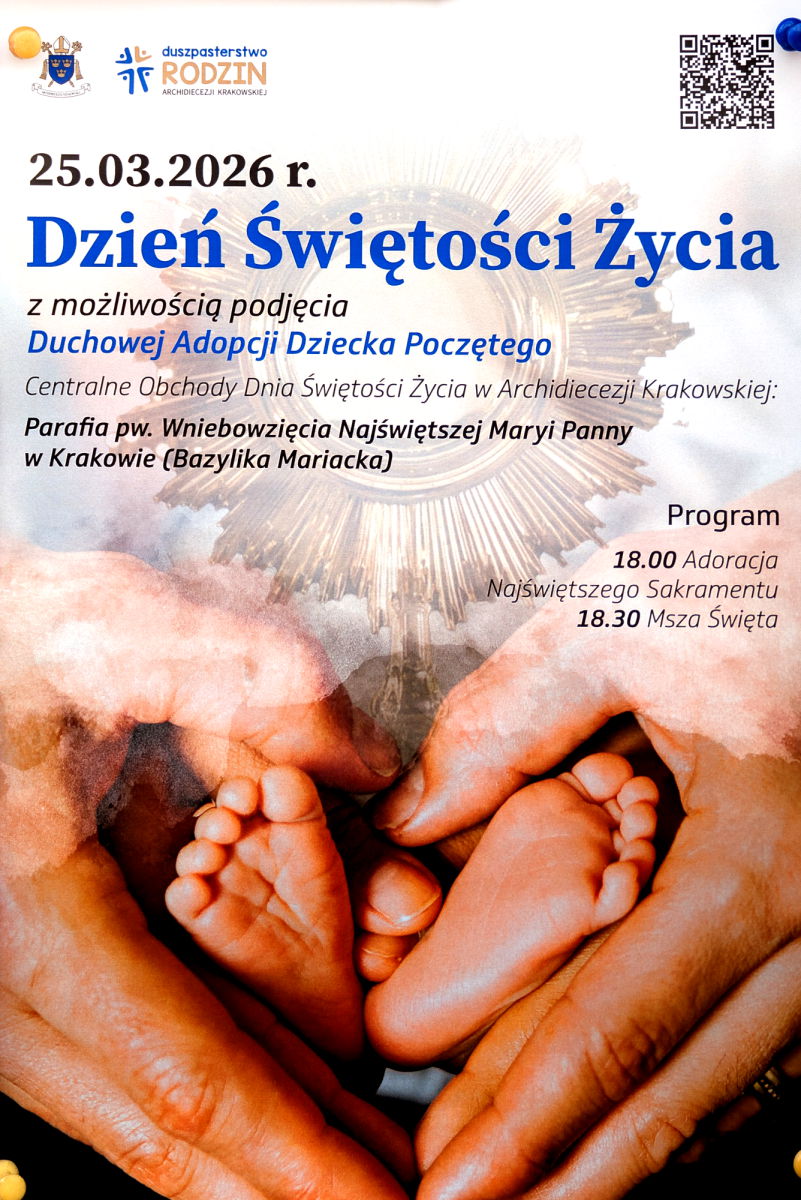 W środę Uroczystość Zwiastowania Pańskiego. Jest to również Dzień Świętości Życia. Dlatego w zakrystii są do odebrania deklaracje o duchowej adopcji, dla tych Wszystkich, którzy pragną się modlić za te Dzieci, które się poczęły, a którym grozi zabicie. Dlatego gorąco zachęcamy, aby tych, którzy będą się w tej intencji modlić, było jak najwięcej. Nie potrzeba tutaj długiej modlitwy… bo nie jest to długa modlitwa, a jakże potrzebna tym bezbronnym dzieciom.