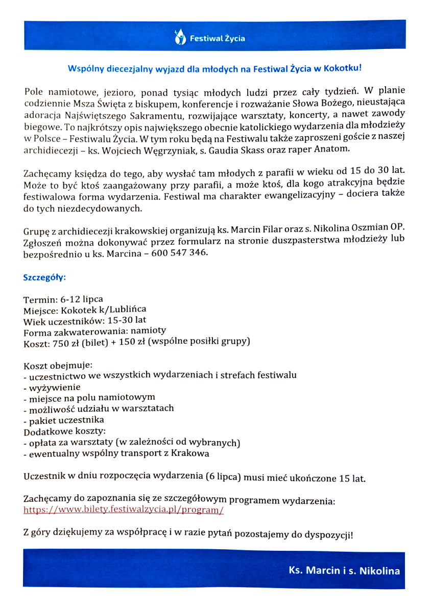 Nasz pan Krzysztof kościelny odchodzi na emeryturę, dlatego rezygnuje ze służby bycia kościelnym. Jeżeli ktoś jest chętny, to bardzo proszę, żeby się do zgłosił do ks. Proboszcza.