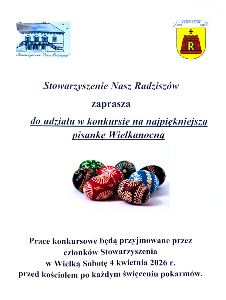 Stowarzyszenie Nasz Radziszów ogłasza po raz dwudziesty konkurs na najpiękniejszą pisankę Wielkanocną. Do udziału w konkursie zapraszamy wszystkich mieszkańców – dzieci i dorosłych.